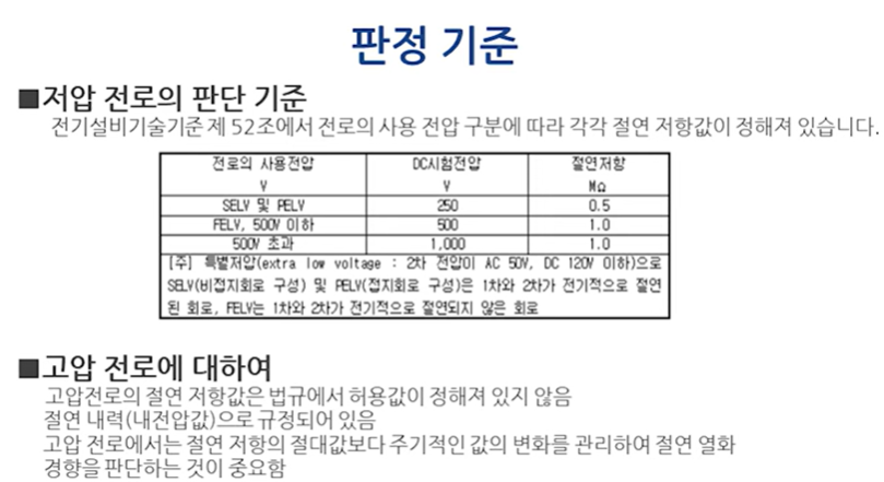전기설비기술기준 제52조에서 전로의 사용 전압 구분에 따라 각각 절연 저항값이 정해져 있습니다. 이는 저압에 해당하는 규정으로